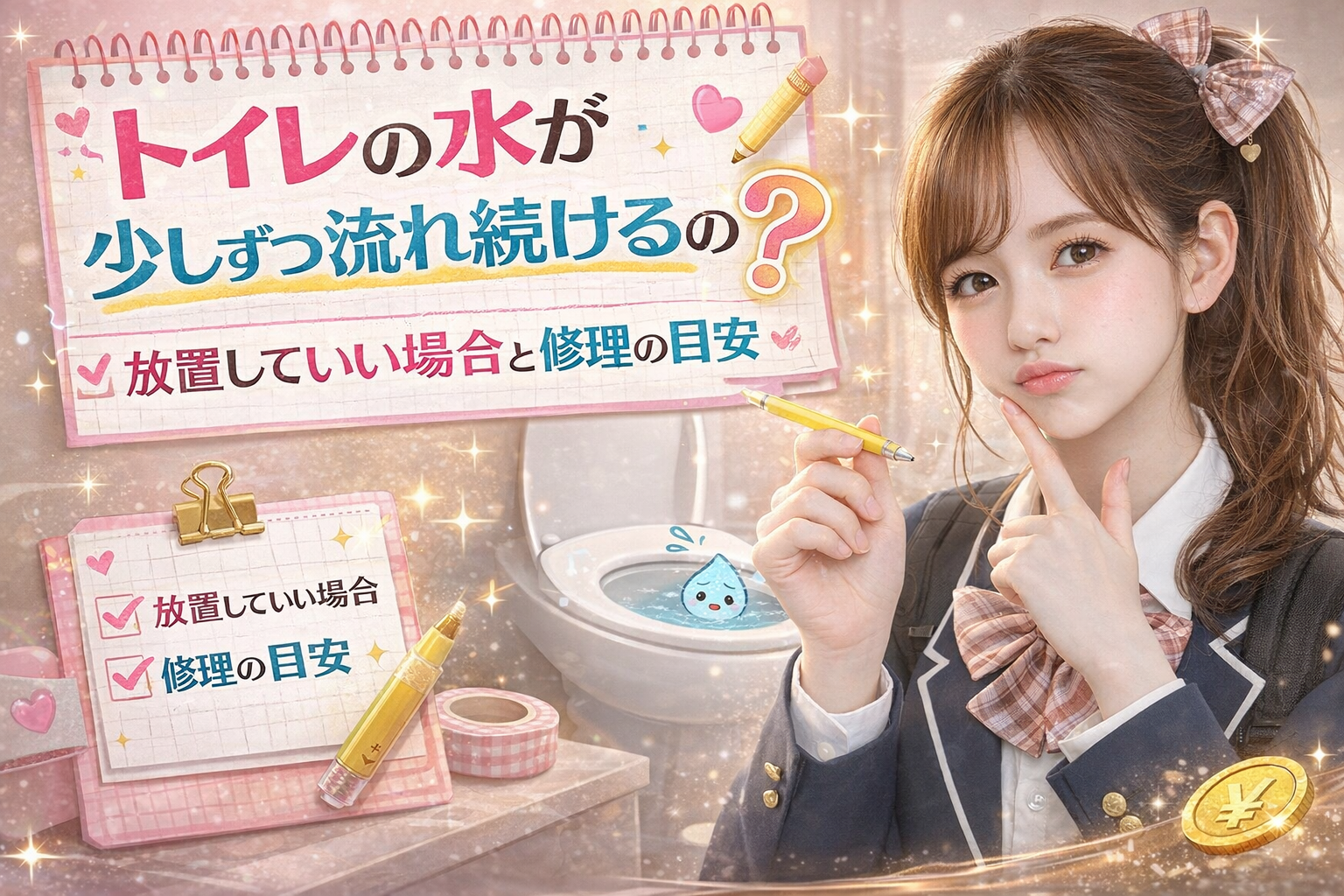 この記事では、トイレの水が止まらない原因と、自分でできるチェック方法をJK目線で分かりやすくまとめたよ!!みんなの家のお財布を守るために読んでみて!!